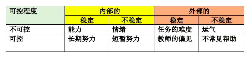 从上面这个表中我们可以看出:能力是稳定的但是不可控;长期努力是稳定而且可控的;短暂的努力是可控但不稳定的;任务的难度是稳定不可控的;教师的偏见是稳定可控的;情绪是不稳定不可控的。